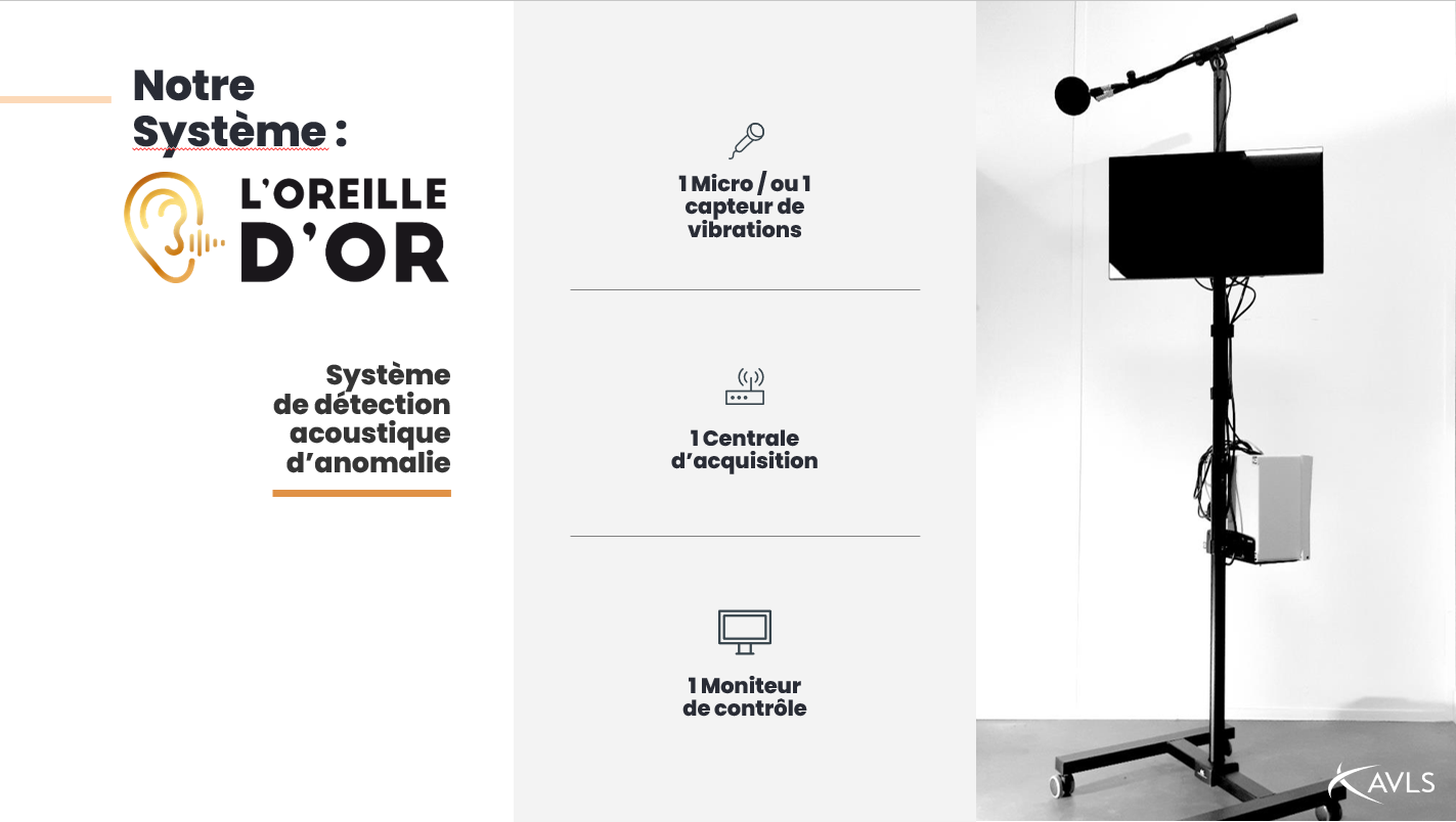 Avec l’Oreille d’Or, nous proposons un système de détection acoustique d’anomalie qui fonctionne 24/24, de manière autonome. Après une phase d’apprentissage par le système de ce qu’est un signal sonore normal, l’Oreille d’Or est en mesure d’identifier un bruit anormal causé par un défaut de production (usinage défectueux, usure de l’outillage, etc.) Une alerte est alors émise (par exemple alerte visuelle, mail ou sms) qui permettra de sortir le produit de la chaine ou d’intervention à temps pour la maintenance de l’outillage.